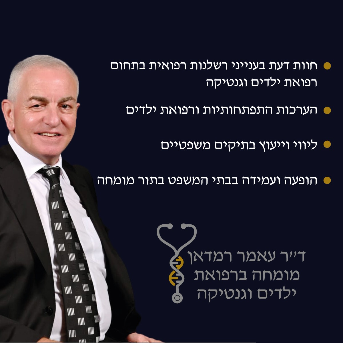 ד"ר עאמר רמדאן הוא מומחה ברפואת ילדים ובגנטיקה רפואית. עוסק ברפואה קלינית לצד פעילות ענפה בתחום חוות הדעת הרפואיות, עם ניסיון עשיר בעריכת חוות דעת במקרי רשלנות רפואית בתחום רפואת ילדים, פגים וגנטיקה. במסגרת פעילותו המקצועית מופיע ועומד בבתי משפט כעד מומחה.